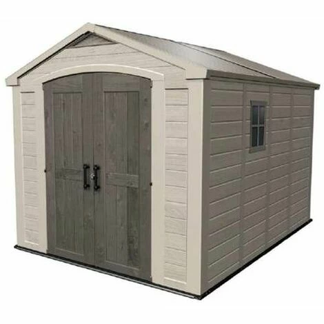 Abri de jardin en polypropylĂšne, aspect bois, Ă©quipĂ© d’une double porte verrouillable, d’une surface intĂ©rieure de 7,4 m2.