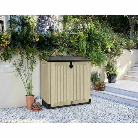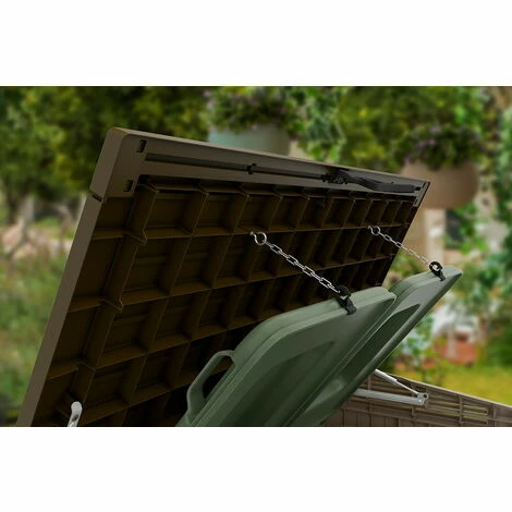 Notre coffre multifonction en résine de 880 L, caractérisé par un design élégant avec un effet en bois, une ingénierie de qualité, une structure robuste qui résiste aux intempéries, est la solution parfaite pour le stockage de vos équipements d’extérieur. Vous pourrez y ranger facilement votre matériel de bricolage et de jardinage, vos poubelles, vos circuits de filtration de piscine ou les jouets des enfants grâce à son ouverture par le haut ou par les 2 portes à l’avant. Peut abriter jusqu’à 2 poubelles de 120L chacune.
