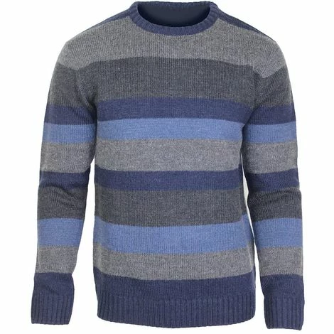 Pull col rond Ă rayures. 30% de laine. Bords cĂŽtes aux poignets et Ă la taille. Chaleur et confort garantis