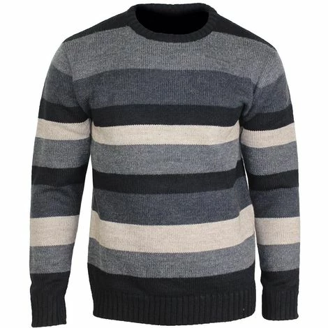 Pull col rond à rayures. 30% de laine. Bords côtes aux poignets et à la taille. Chaleur et confort garantis